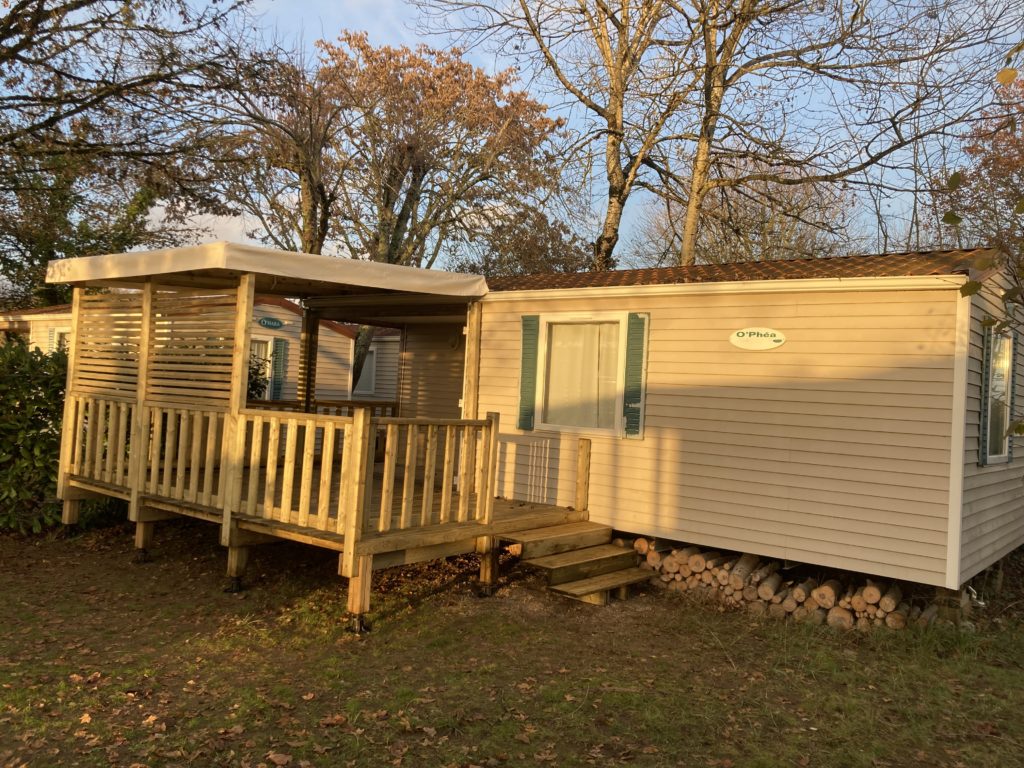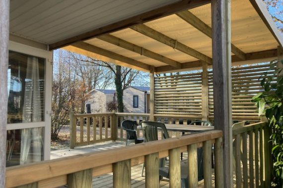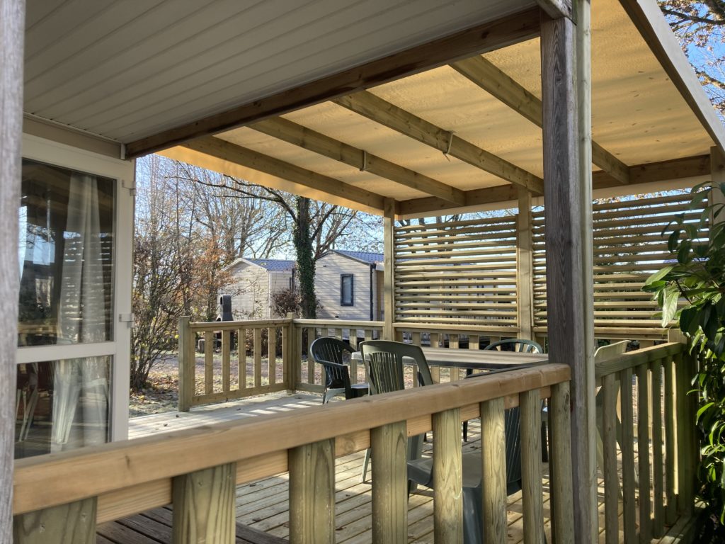 More outdoor space with its 18 m² semi-covered terrace. This COMFORT mobile home is designed for 4 people with 2 bedrooms. With a surface area of 24.5 m², it is ideal for a couple with 2 children. It features one bedroom with a 140×190 double bed and one bedroom with two 80×190 single beds, a kitchen area equipped with a 210 L fridge/freezer, a shower room and toilet, and finally an 18 m² semi-covered terrace. Your vehicle will be parked on your pitch. TV (TNT HD) included – Free WiFi for 2 hours per day – Parking space on the pitch Pets welcome